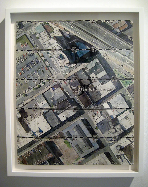 Lunch Break, painted on 30 "iPhones" documents a 30 minute walk through DUMBO, a physical folded map, based on a Google Map walk, both examine the rituals of daily life and routine, each day virtually the same, back and forth from the studio, the same song repeated over and over, with subtle shifts that make it unique.